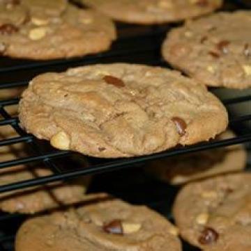 2.将黄油,花生酱,白糖和红糖在大碗里搅拌在一起。然后一次打入一个鸡蛋,再加入香草精。将面粉,可可和烘焙苏打混在一起后加入花生酱混合物。然后再加入巧克力豆,花生酱块和花生酱杯小块。混合好后用汤匙舀出放到没刷过油的烤盘上。