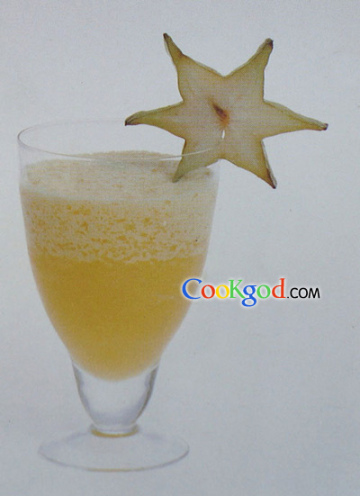 2、搅拌至粉碎后倒入果汁杯中。杯边饰卜杨桃片。
