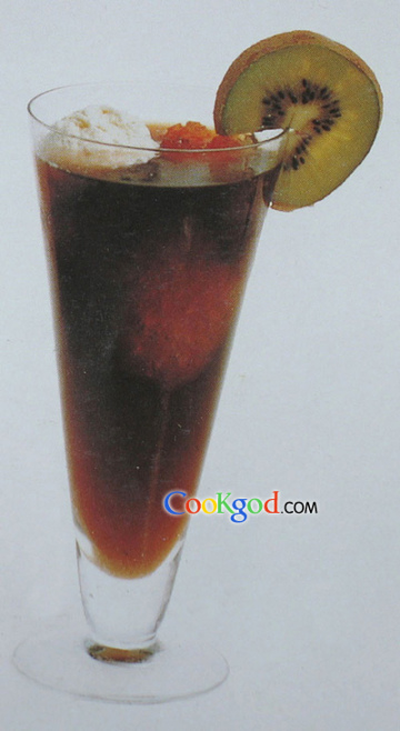 配方:冰块1杯,热咖啡150毫升,糖水1盎司,鲜奶油1袋,香草冰洪淋1小球