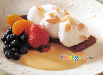 (4)将蛋白球放在碟上,加上鲜果及汁液,即可享用。