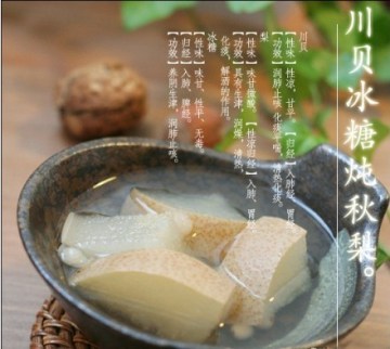 川贝冰糖炖雪梨滋润甘甜、清香宜人,如果不咳嗽也可以免加川贝。 梨富含果糖,粗纤维,钙、磷、钾、铁等矿物质和多种维生素等。有降血压、养阴清热、润燥消风、醒酒解毒、止咳润肺的功效,患高血压、心脏病、肝炎、肝硬化的病人,经常吃些梨大有益处;梨能润肺养脾、促进食欲帮助消化,并有利尿通便和解热作用,可用于发烧高热时补充水分和无机盐。煮熟或蒸熟的梨有助于肾脏排泄尿酸和预防痛风、风湿病和关节炎;在秋季气候干燥时,人们常感到皮肤搔痒、口鼻干燥,有时干咳少痰,经常吃冰糖川贝炖雪梨可缓解秋燥,止咳平喘、有益健康。