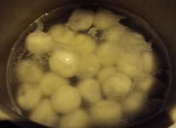 3、把汤圆放滚水里煮,汤圆浮上水后,加酒酿,烧开后加糖,大功告成!