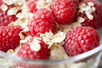 3、在容器底部铺一层覆盆子,加一层奶油,再一层覆盆子,以此类推,最后撒上烤过的燕麦即可!