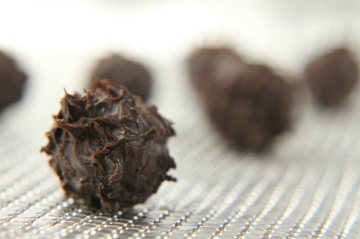 9.将淋好的巧克力放在不粘布上,用工具不停的滚动,拔出巧克力尖即可