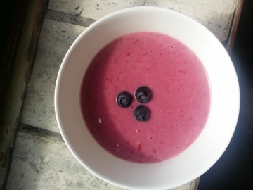 配料:超市买的冰冻mixed莓(树莓,蓝莓还有各种小莓),香蕉一根,低脂牛奶,半个鳄梨(可加可不加,完全因为早上剩了半个),一勺半茶匙白糖,建议放果汁 特别是苹果汁,这样可以少加糖。