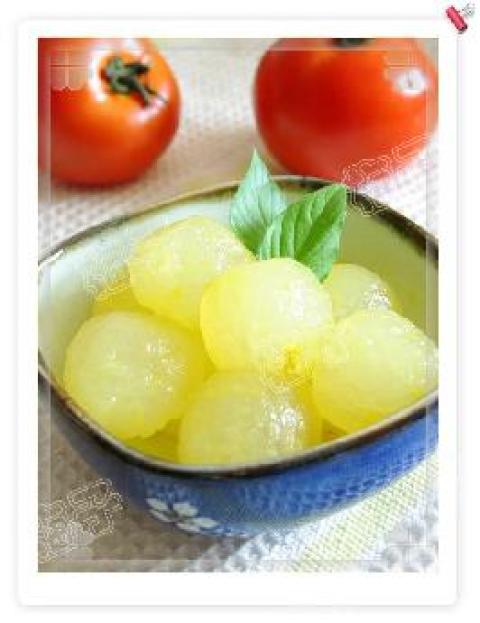 1.冬瓜挖成球状用盐开水烫熟后沥干水.