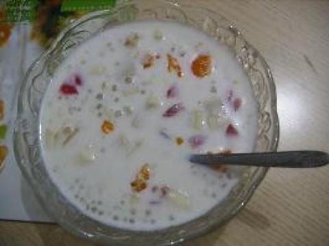 4.我把西米倒进牛奶里。然后,放进去切成丁的杂果。