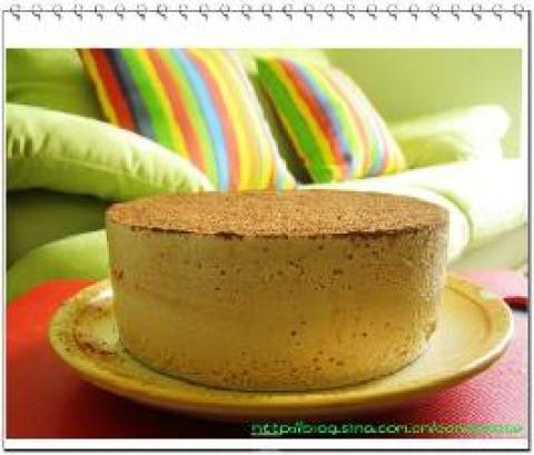 5.将烤好的蛋糕剖成三片,俺吃了一片,嘿嘿~~~剩余的两片来做咖啡慕斯。放一片蛋糕在最底,倒入慕斯料,再放一片蛋糕,最后将剩余的慕斯料全部倒入。放入冰箱冷藏一晚,拿出用电吹风围着边吹一圈,轻轻一推就脱模了哦!面上撒上可可粉装饰即可。