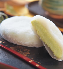 3.将作法2分割成每个50公克后,再包入作法1中分成每个50公克的青豆馅料后,双手先沾上少许日式太白粉,再整成扁圆形即可。