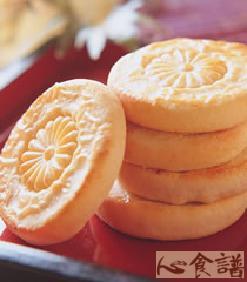 a.煮熟蛋黄43公克,b.白豆泥馅288公克,水麦芽24公克,鲜奶油10㏄,奶油18公克,味醂10㏄,c.低筋面粉20公克,扁圆形铝模1个,菊花烙印1个,d.金枣蜜饯丁60公克,白豆泥馅300公克,水麦芽15公克,奶油15公克,e.蛋黄1颗,莱姆酒5㏄