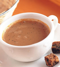 2.将即溶咖啡放入杯子中,先沖入1大匙热水溶解咖啡,再放入黑糖块,最后将热豆浆倒入即可。