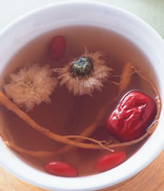 红枣20公克,枸杞10公克,参鬚5公克,菊花3公克,水700cc