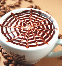 5.于作法4咖啡杯上方奶泡以同心圆方式挤上数圈巧克力酱(份量外),再以木叉由内而外画出线条,在转而由外而内画出线条,雕出放射状装饰即可。