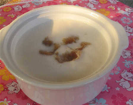 2.然后放锅中煮沸加冰糖即成.份量不用十分的精确.不是做西点.米可以多一点,这样煮出来就成杏仁糊.加上煮好的银耳可以当减肥食品.