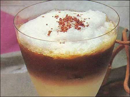 先在杯中滴上2滴椰子香精,注入深煎炒的咖啡和煮沸的牛奶60亳升,再加一匙奶油浮在上面,撒上一些熟椰子末作装饰即可。