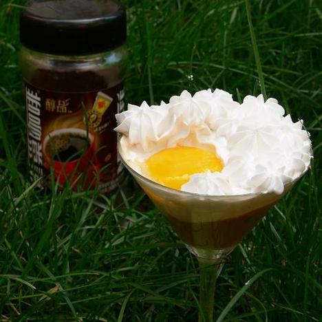 2、打发的淡奶油轻轻放在咖啡上面,最后放上一只鸡蛋黄。