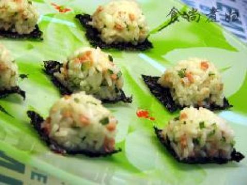 4:把海苔片剪成小片放在盘子上,将拌匀的饭团摆在海苔片上