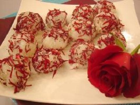 4、 玫瑰花瓣剪成细丝,将蒸好的饭团裹上玫瑰花丝即可。