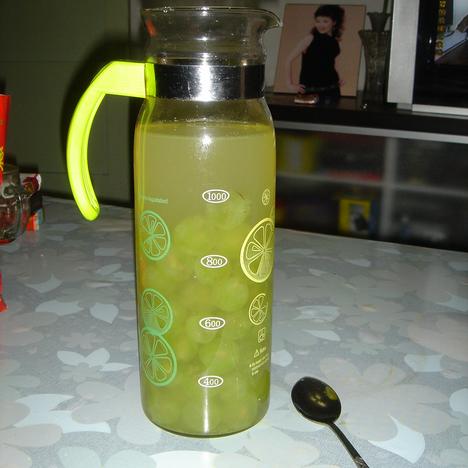 2、将葡萄放人饮品壶中,加入适量纯净水。