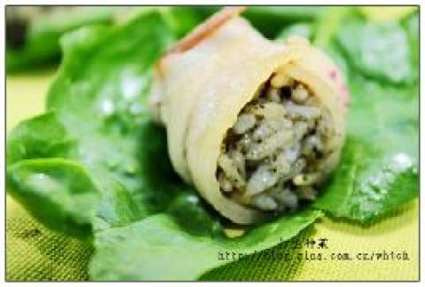 2.将五花肉片放入锅内略煎一下,变色后就马上拿出 ;将拌好的饭捏成饭团,要捏紧 ;放到肉片上卷上,牙签固定 ;再入锅内略煎既可