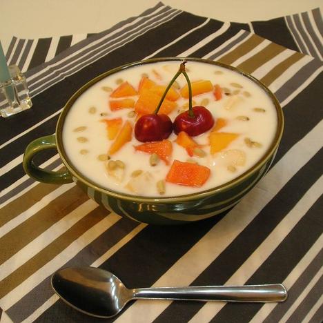 上覆切碎的木瓜,洒一把松仁,点缀一个樱桃即可