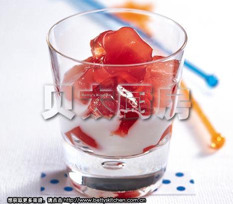 4、将花瓣形的玫瑰冻放入玻璃杯中,加入牛奶(或椰汁)即可。