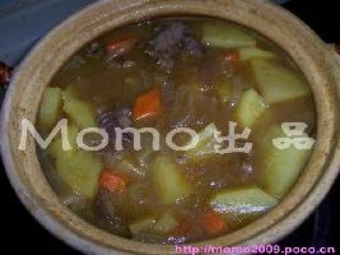 8.咖喱块完全溶解后加入土豆小火煮15分钟,并边煮边搅拌不让咖喱煮糊直至土豆熟即可。