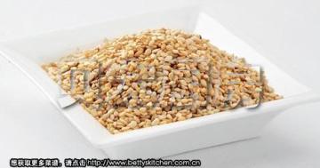 1、芝麻放入炒锅中,以小火慢慢焙成淡黄色,放凉后倒入密封的玻璃容器中保存。