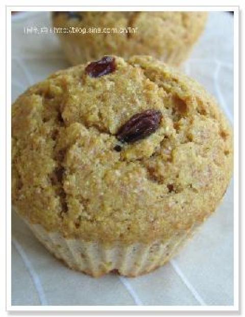 全麦面粉1杯,玉米面0.5杯,麦芽粉0.5杯,无明矾泡打粉2小匙,砂糖2大匙,盐适量,有机黄油3大匙,1个鸡蛋1个,脱脂牛奶0.5杯,美国提子2大匙