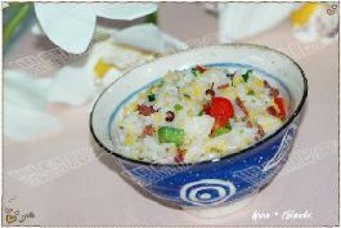 1.培根与甜椒切小粒,香葱切末。糯米、大米与玉米渣淘洗后混合加清水浸泡半小时备用。