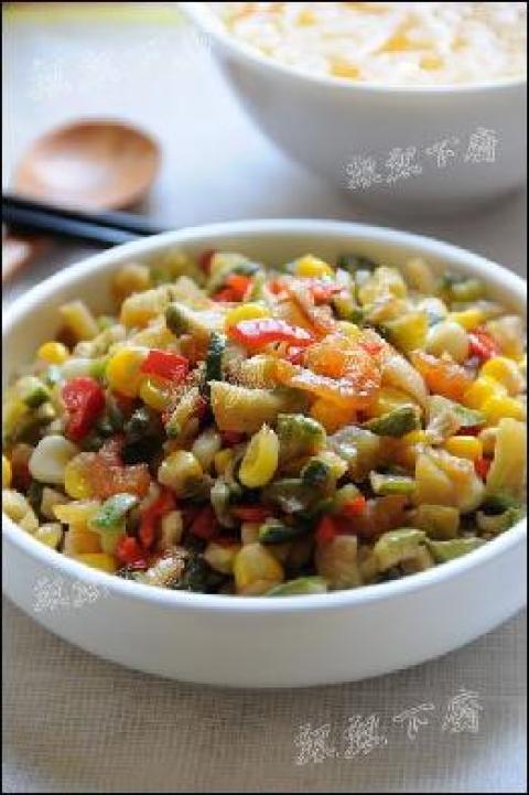 懒龙说俺切太小了,不够他大口朵颐的,说我常喜欢把菜切碎炒,我说你用勺子嘛真是,我是为了配合玉米的大小切的,食材总要差不多大小才好啊。