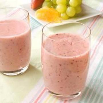 去蒂草莓145克,冷冻蓝莓50克,香蕉2个(剥皮并切成块),橙汁120毫升,原味酸奶335毫升,豆奶粉1汤匙
