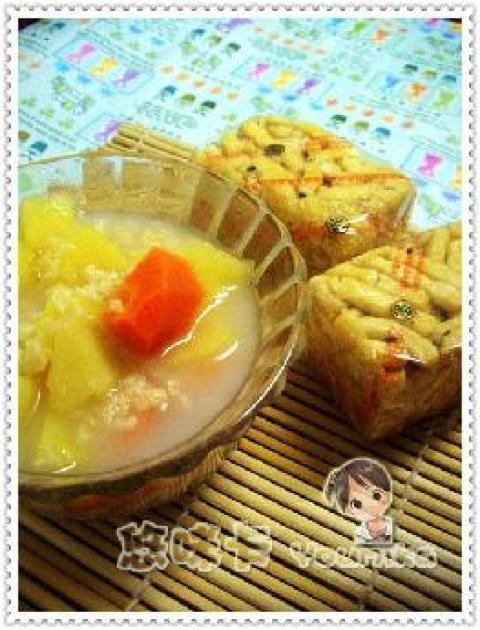 皮蛋咸肉粥、碎米芽菜生菜饭卷、紫米荔枝冰粥、米饭布丁、苹果粥