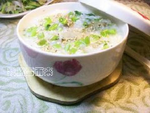 4.用锅粥的余温将香芹的味道焗出。然后出锅时撒上熟芝麻食用。由于香芹的味道很重,可不放香葱。