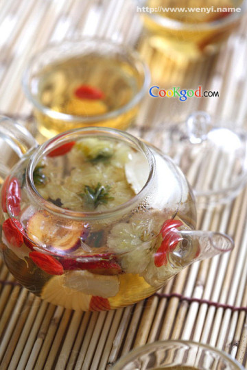 2)将山楂,菊花,枸杞,桂圆和西洋参片放入壶中,倒入开水,盖上盖子焖5分钟后调入蜂蜜搅匀即可。