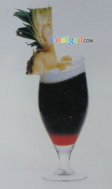 配方:热咖啡150毫升,冰块1杯,龙眼蜜1盎司,红石榴汁1/3盎司,鲜奶油1袋,凤梨片适量