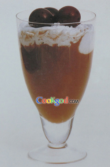 配方:蛋黄1只,龙眼蜜/2盎司,白兰地1/3盎司,玉桂粉少许,巧克力冰淇淋1小球,冰块1杯,糖水1盎司,热咖啡1150毫升,鲜奶油1袋