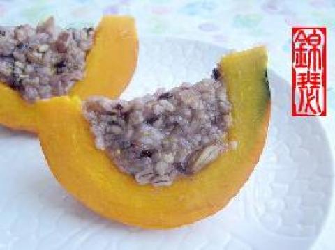 2.南瓜切半,挖去籽,八八宝杂粮饭填充进去,上中火蒸熟。