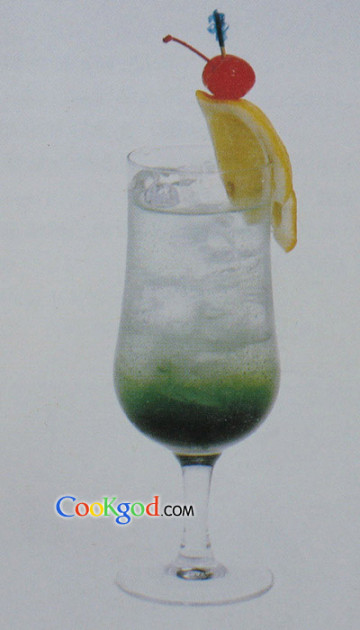 配方:百香果汁1盎司,蓝橘汁1/4盎司,柠檬汁1/4盎司,红石榴汁1/3盎司,冰块1杯,七喜汽水1瓶