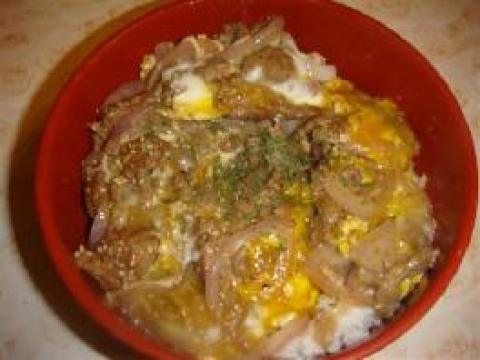 3.煮出甜味后再将牛肉倒回去翻炒煮一下,转大火淋下蛋汁后一分钟熄火,起锅铺在热饭上,上面可加青葱末或parley随意。