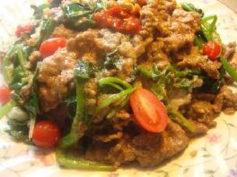2.再加入1大匙油入锅后,放入芥蓝菜同牛肉快炒,加一点点盐.然后下芡水,洒点香麻油后,完成.