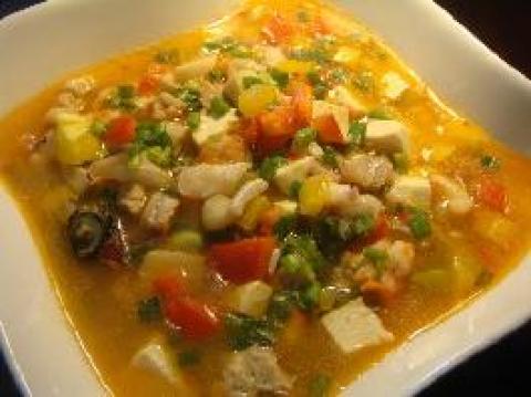 瘦肉末,虾粒,花枝头,肥蚵,杏鲍菇,绿豆仁,豆腐,红椒,黄椒,青葱,橄榄油,酒酿,香麻油,白胡椒粉,醋,豆瓣酱