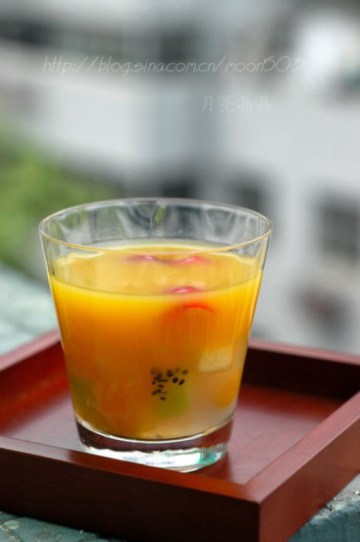 5.剩下的橙子、奇异果和苹果丁(留几粒等下放在果汁中)放入榨汁机榨出果汁。倒在凝结好的果冻杯里,撒上水果粒即可