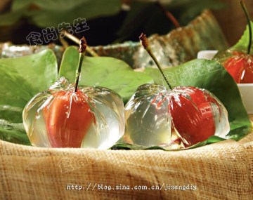 水晶糕粉5克,樱桃1个,金丝1根,砂糖50克,糖浆250克,水500克,装饰叶1片