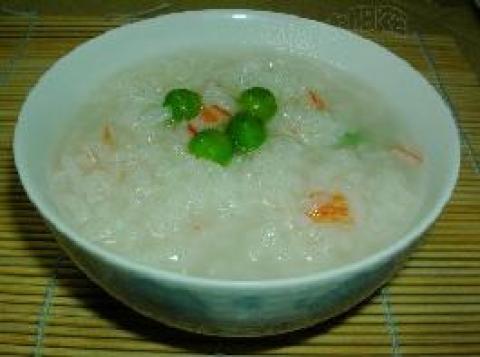 鲜虾5个,粳米50克,白菜10克,盐、鸡精适量