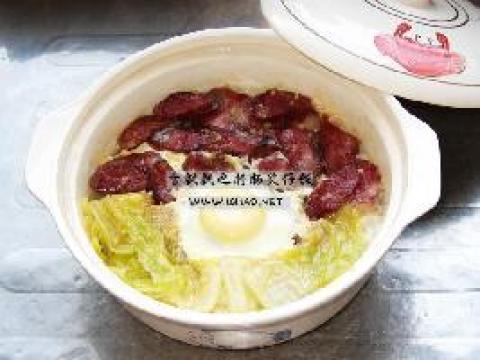 5.腊肠熟后,闻着香喷喷的味道,把白菜码上去,闷蒸一下下,再在上面打一个鸡蛋,基本就大功告成啦~