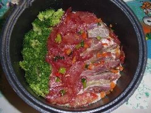 白米155公克,腊肠1条,腊肉100公克,青菜少许,水240公克,酱油1大匙,油1/2小匙