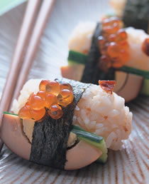 2.将寿司饭握捏小团数团,取1小团放上作法1的小黄瓜、茶叶蛋捲上紫菜,最后放上鲑鱼卵,重复此步骤直到材料用尽即可。