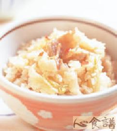 4.将作法1、3和水放入电子锅中混合拌匀,按下电子锅煮饭键,煮至电子锅跳起后,略翻搅,再焖煮10∼15分钟即可。