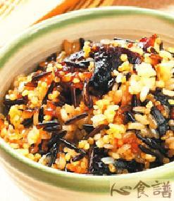 2.白米及小米洗净后沥干水分与桂圆肉及作法1的野米拌匀放入电子锅中,浸泡30分钟后按下开关蒸至开关跳起,再焖十分钟。